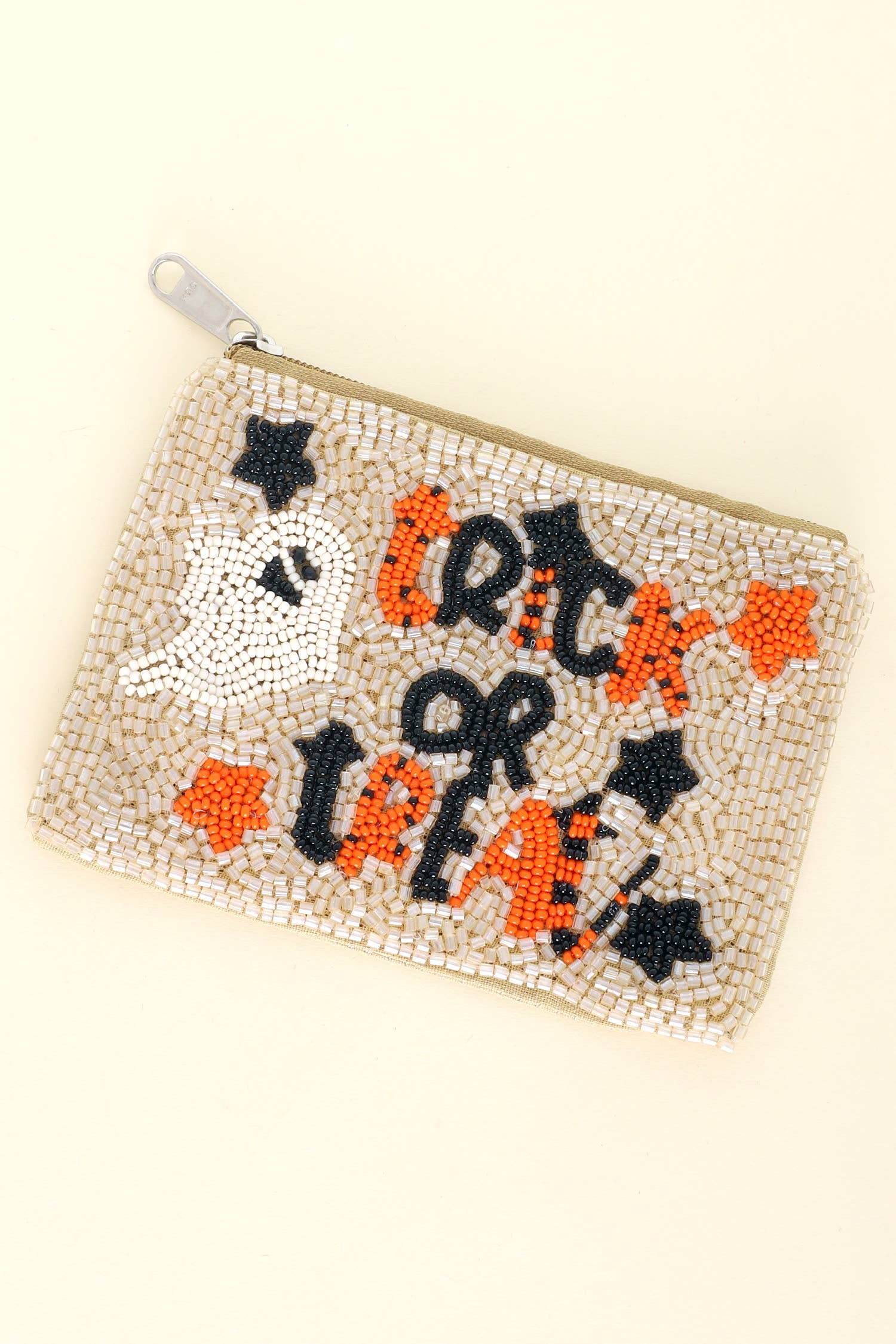 LETTERING TEXT TRICK OR TREAT HAT STAR GHOST EMBELLISHED SEED BEAD BEADED SPOOKY OCTOBER SEASONAL HOLIDAY HALLOWEEN COIN PURSE WALLET POUCH BAG MAKEUP VACATION TRAVEL CARD HOLDER CARD CASE KEY MONEY POUCH NOVELTY BAGS COIN BAG
